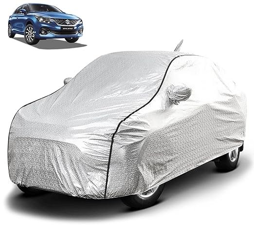 Biroller Waterproof Car Body Cover for Maruti Baleno New with Mirror and Antenna Pocket, Soft Cotton Lining, Triple Stitched (Heat Resistant Metallic Silver with Black Piping)